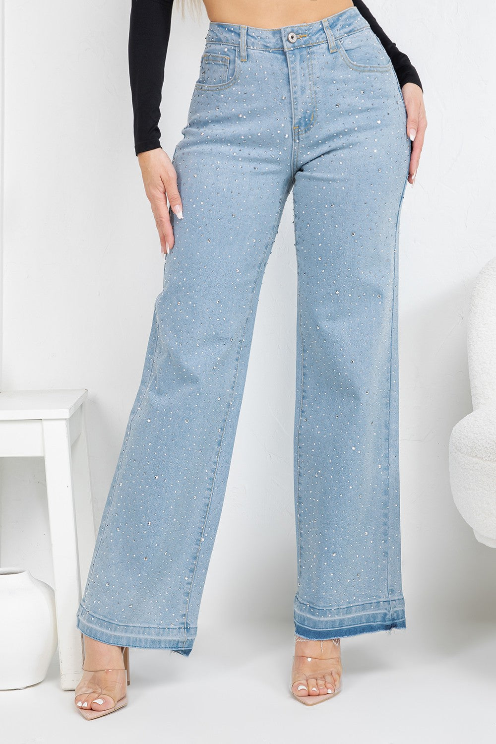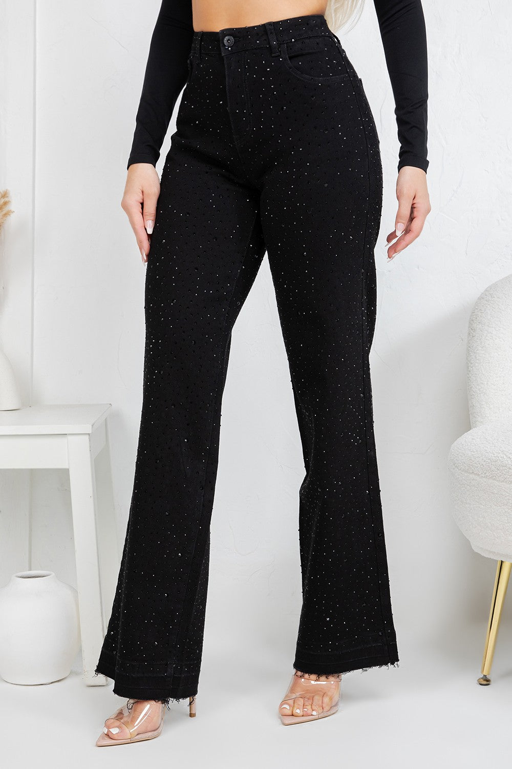 • High-rise rhinestone-studded jeans designed to add instant sparkle and elevate any look.