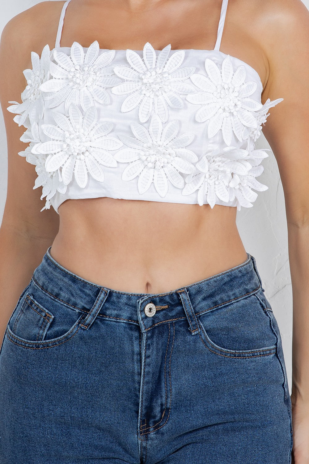 • Trendy 3D floral crop top featuring bold flower appliqués for a romantic, statement look.