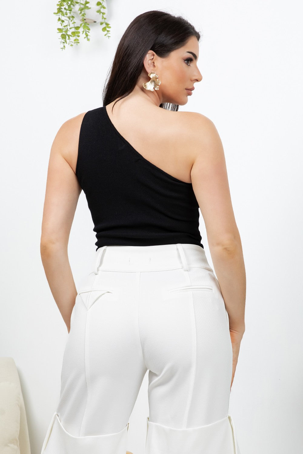 Dorotea a one-shoulder knit blouse featuring matching knit rose flower details on the shoulder. designed with a feminine and elegant silhouette.