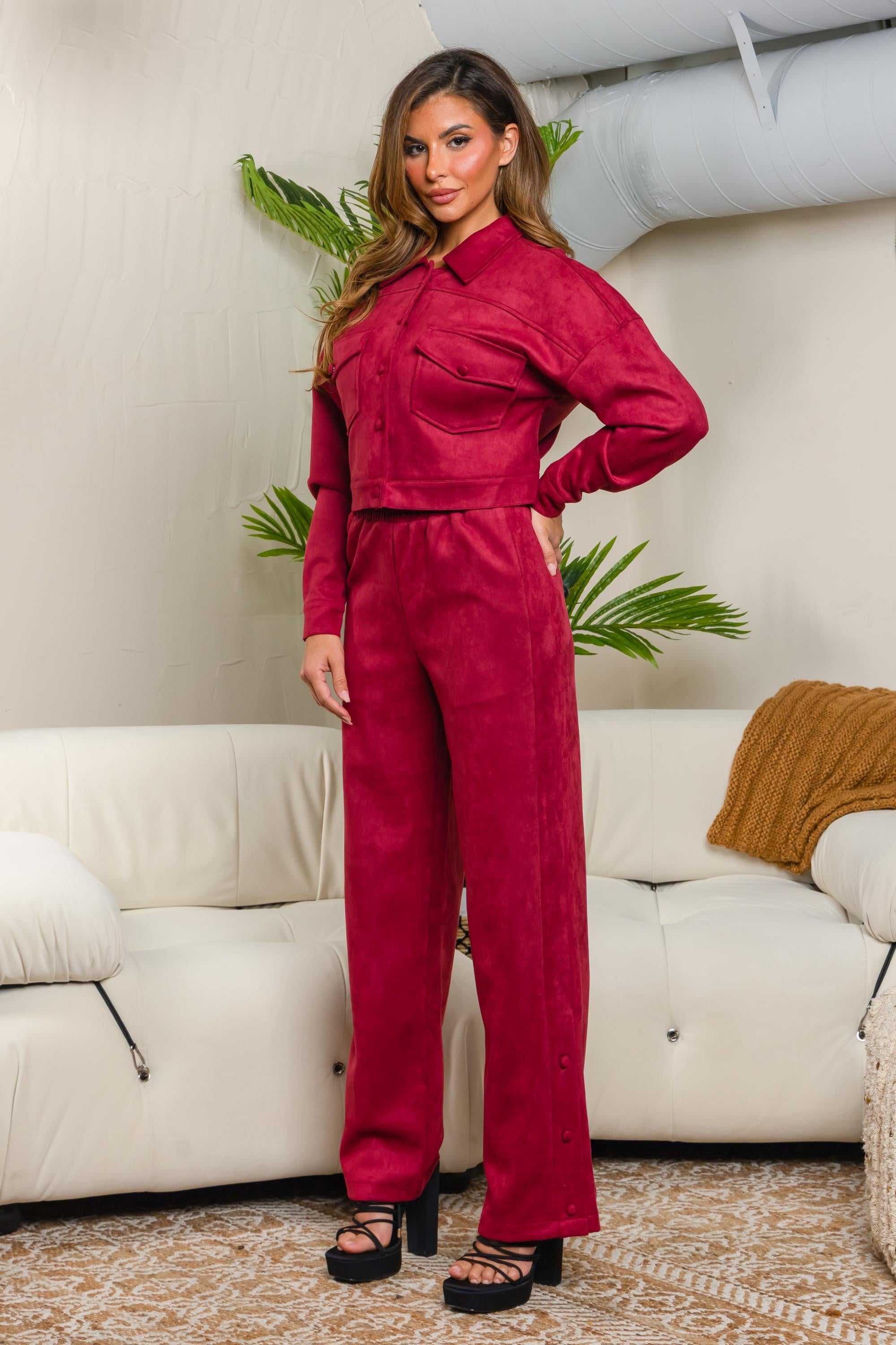 • Jacket: cropped length with a classic collar, button-front closure, and two flap chest pockets for a stylish utility look